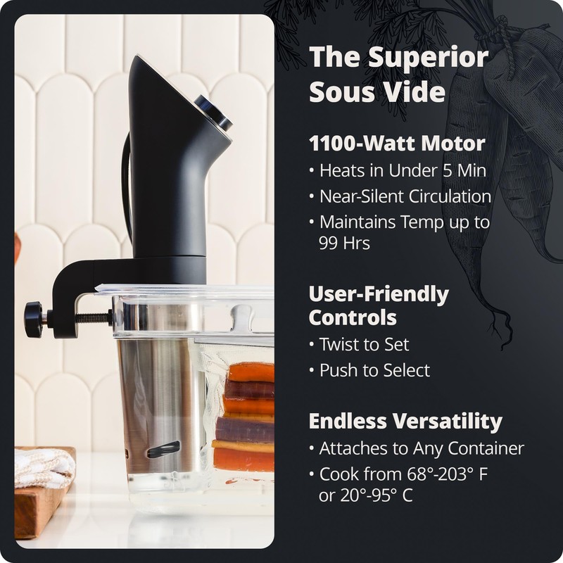 • A Premium Choice: Greater Goods sous vide cooker is powerful and quiet—the best of both worlds and the ultimate precision cooking device. At 1100 watts, this sous vide cooker will get up to your desired temperature in no time, and with its brushless motor, all you will hear is a gentle ripple.