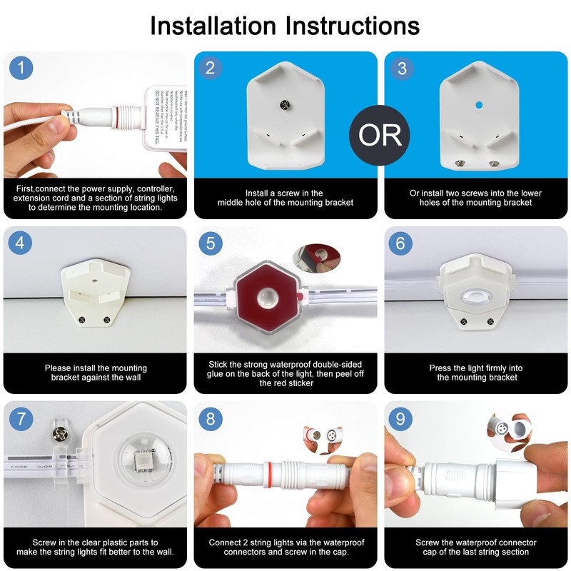- DIY Installation: Secure the mounting bracket close to the wall with screws. Apply double-sided tape to the light bead, remove the adhesive paper, and press firmly onto the bracket. Screw in the clear plastic parts to make the light string fit the wall better. Repeat for each bracket and bead. Connect each 16.5FT with waterproof joints. Includes three 16.5FT strings. *Note: The installation manual in the package is incorrect. Please follow the product images and the instructions here to install.