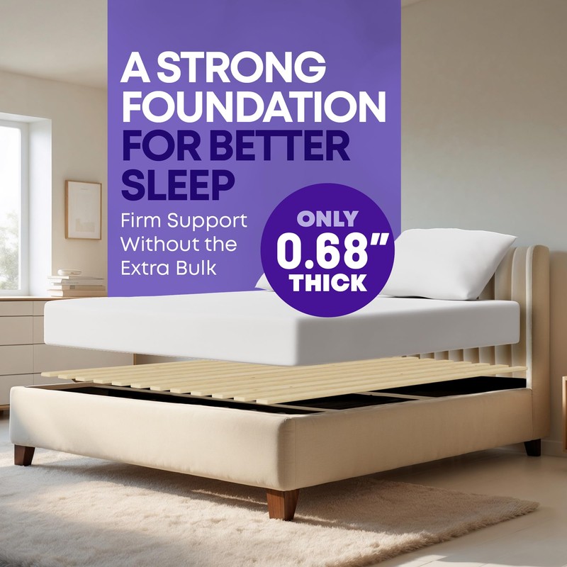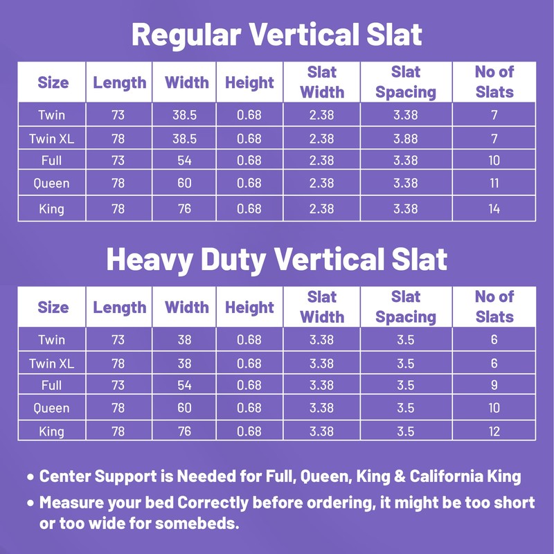 - LIGHTWEIGHT & EASY TO INSTALL – These lightweight bed support slats arrive bundled and ready to use. No tools or hardware required—just lay them on your bed frame. Choose standard (2-3/8") width or heavy duty (3-3/8") width. See chart for more sizing and gap details.