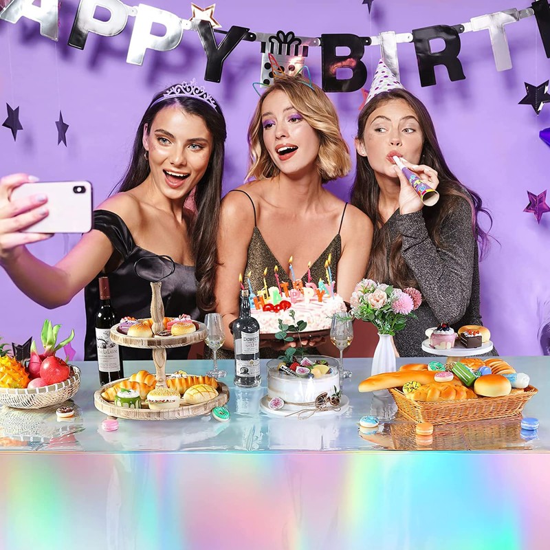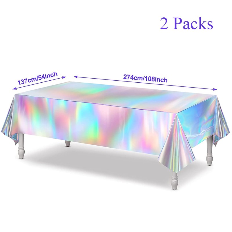 - Create a mesmerizing ambiance at your party with our iridescent tablecloth, featuring a holographic design that adds a touch of magic to any event.
