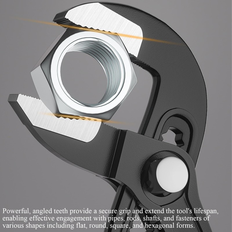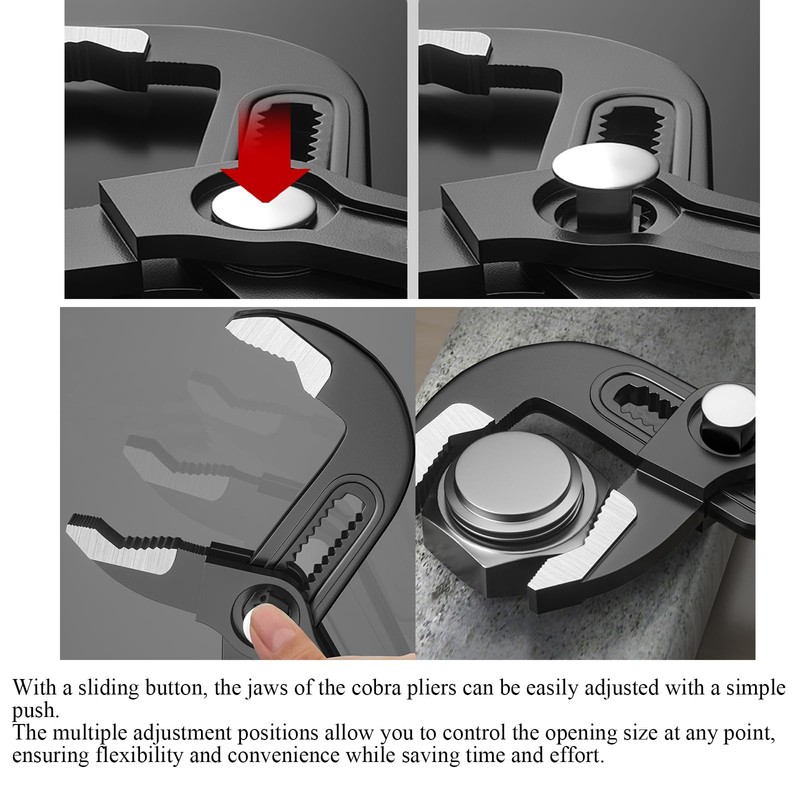- With a sliding button, the jaws of the cobra pliers can be easily adjusted with a simple push. The multiple adjustment positions allow you to control the opening size at any point, ensuring flexibility and convenience while saving time and effort.