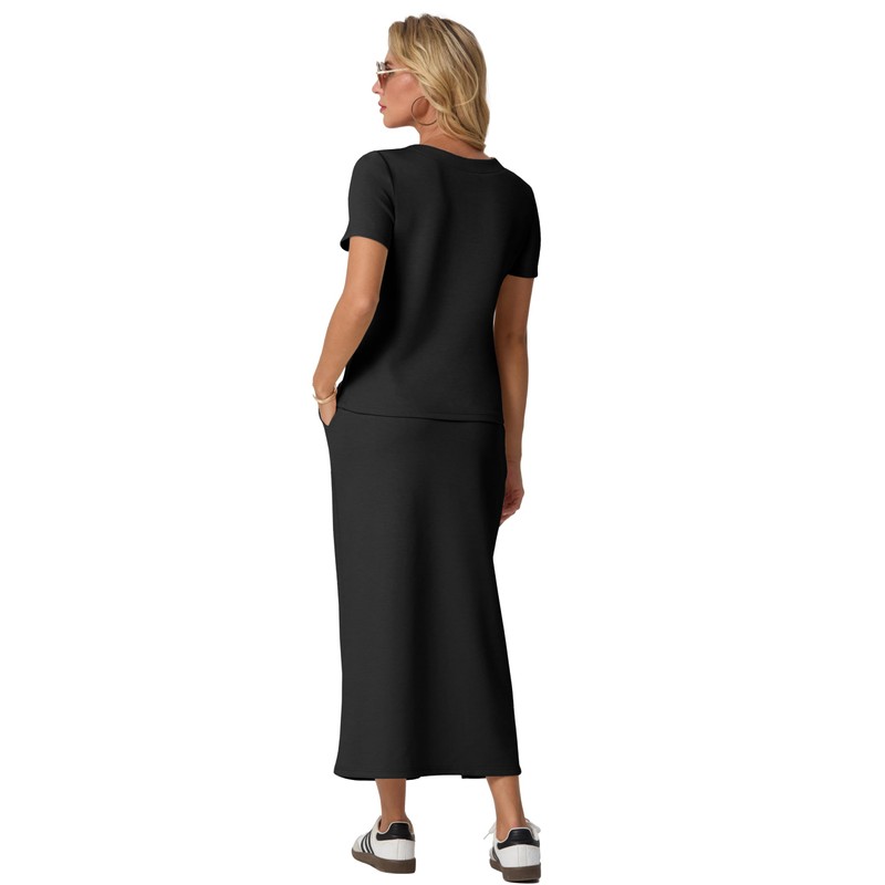 GRECERELLE Summer 2 Piece Sets for Women Casual Short Sleeve Top and Side Slit Midi Skirt with Pockets (Black, Medium)