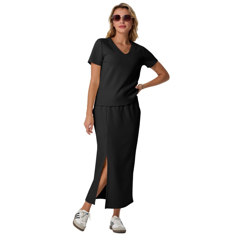 - [Focal Point] Two piece outfits: V-neck, short sleeve top with a relaxed fit, paired with an elastic waist midi skirt featuring a single side slit and two side pockets. Perfect for any shoe style, from sneakers to sandals and heels.