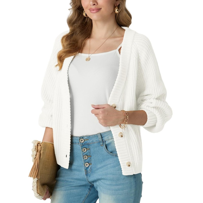 Wrap yourself in cozy-chic confidence this season! Our Women's Button-Front Cardigan Sweater masterfully blends comfort and fashion with its plush thick-knit construction and flattering silhouette. The deep V-neck design adds a touch of sophistication while visually elongating, perfectly complemented by statement lantern sleeves and secure ribbed cuffs that lock in warmth. Designed with a relaxed, short-length fit, it provides effortless coverage without bulk, making it your ultimate go-to layer.