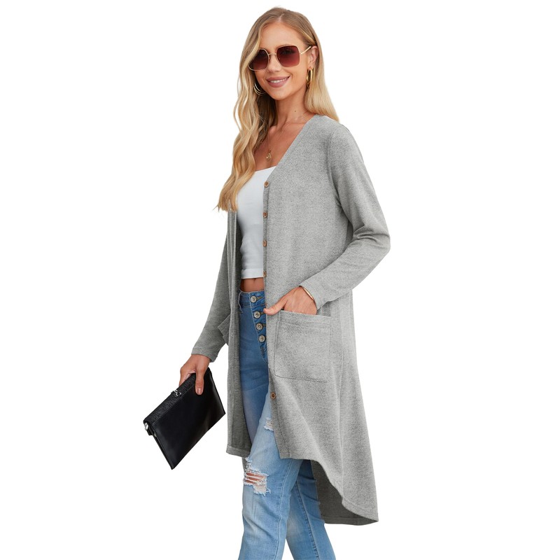 GRECERELLE Women's Long Lightweight Cardigan Long Sleeve Button Down Loose Outwear Cardigans Jacket with Pockets for Ladies UK Grey-M