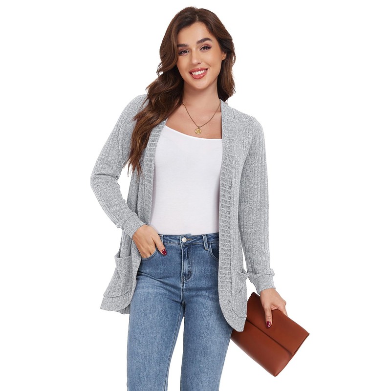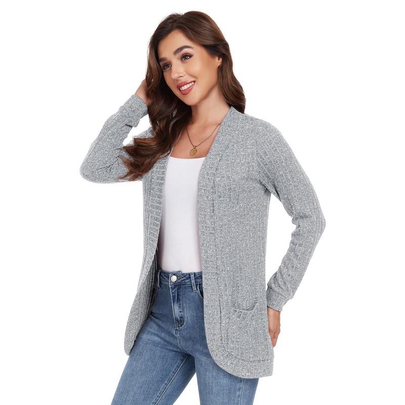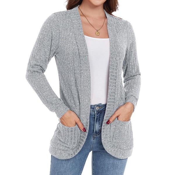 GRECERELLE Women's Long Sleeve Open Front Casual Lightweight V-Neck Grey Cardigan Sweater with Pockets, Medium