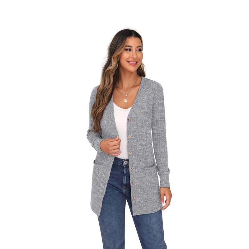 GRECERELLE Womens Cardigan Long Sleeve Open Front Cardigans Button Down V Neck Ribbed Knit Lightweight Outerwear with Pocket (Grey, L)