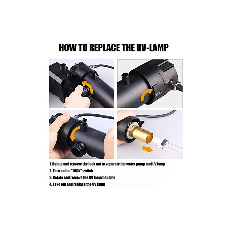 • Voltage: 110V-120v/60Hz ;Pump Power: 54W ;Lamp Power: 9W ;Max Flow Rate: 660GPH ;Cord Length: 33ft with UL Plug