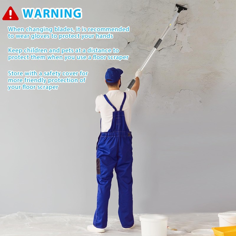 - Tips: We recommend that you separate the front and back of the long handle razor blade scraper (HS for front) when changing the blade to avoid dislodging tile scraper tool, and we recommend wearing gloves to protect your hands; please cover the safety lid when storing it to protect yourself as well as your iron paint scraper tool in a more friendly way. When using our floor scraper long handle heavy duty, pay attention to the protection of the floor, walls and other sites, we recommend not to use it on the wooden floor