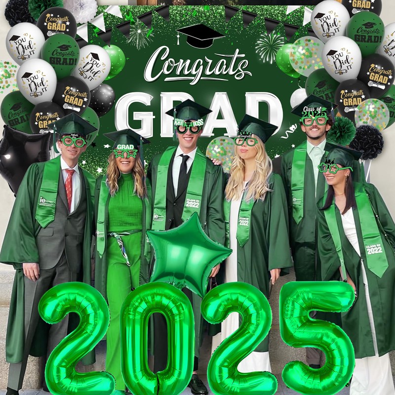 - Grad Pack List: Graduation balloons with printed (dark greenx6, whitex6, blackx6,confeeti balloonsx4), congrats grad backdrop x1, 18'' green and black stars foil balloonsx2, huge 32in 2025 foil balloonsx1, grad eyeglasses props x6, paper pom poms x5, one pack of shiny silver confetti, balloons ribbons x1, glue dots x3.