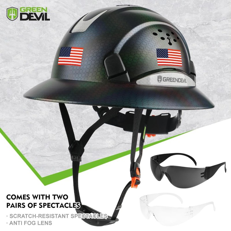 GREEN DEVIL Full Brim Hard Hat Vented Construction Safety Helmet OSHA Approved Cascos De Construccion ABS Work Hardhat for Men&Women 6 Point Adjustable Ratchet Suspension Custom Pattern Design