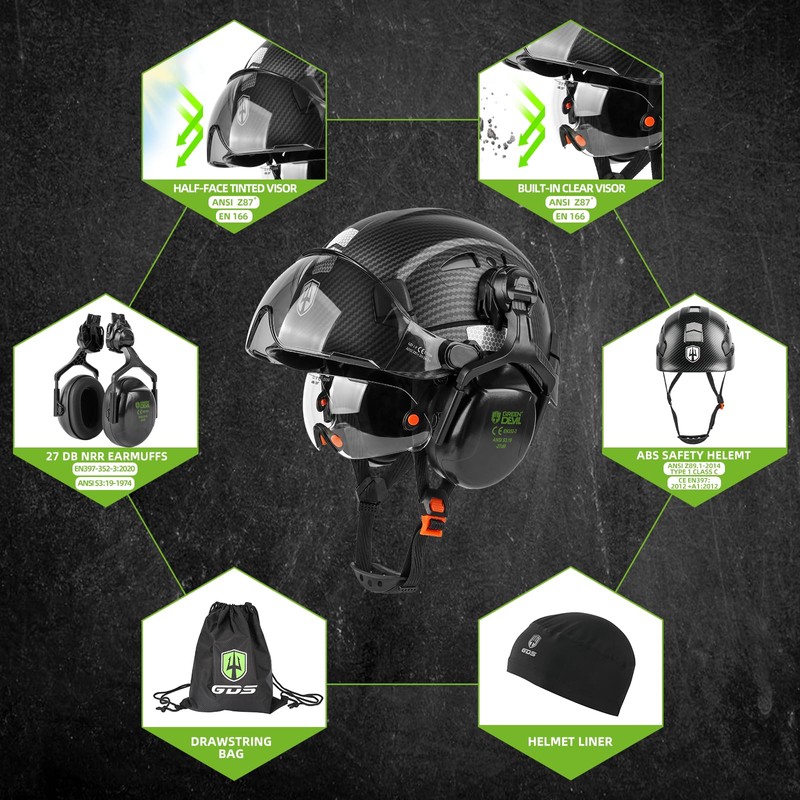 - Thoughtful Quality Service:GREEN DEVIL hard hat with dual Layers visor and ear protection combination is a good partner in your work. It is also a unique gift for family and friends.If you have any questions or suggestions about our safety helmet, please feel free to contact us. We are here 24/7 to chat and and give you the most satisfactory results and help.