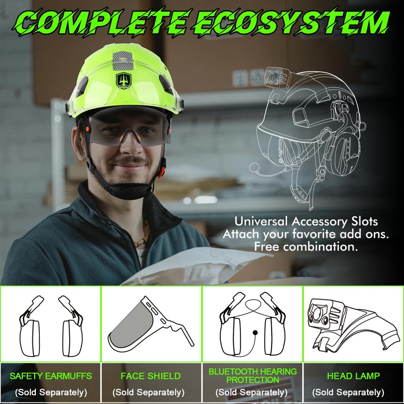 • More Humanized Design:Complete with Rapid-Dial ratcheting headgear,one-handed adjustment design allows workers to modify fit without removing work helmet,even with gloves on.Sliding vent holes allow easy opening and closing based on weather conditions .Universal slots design ensures that safety hardhats to install attachments.And the safety helmet has Hi-Viz reflective stickers on the front-rear-and sides of the helmet allows the users increased visibility under low light conditions.