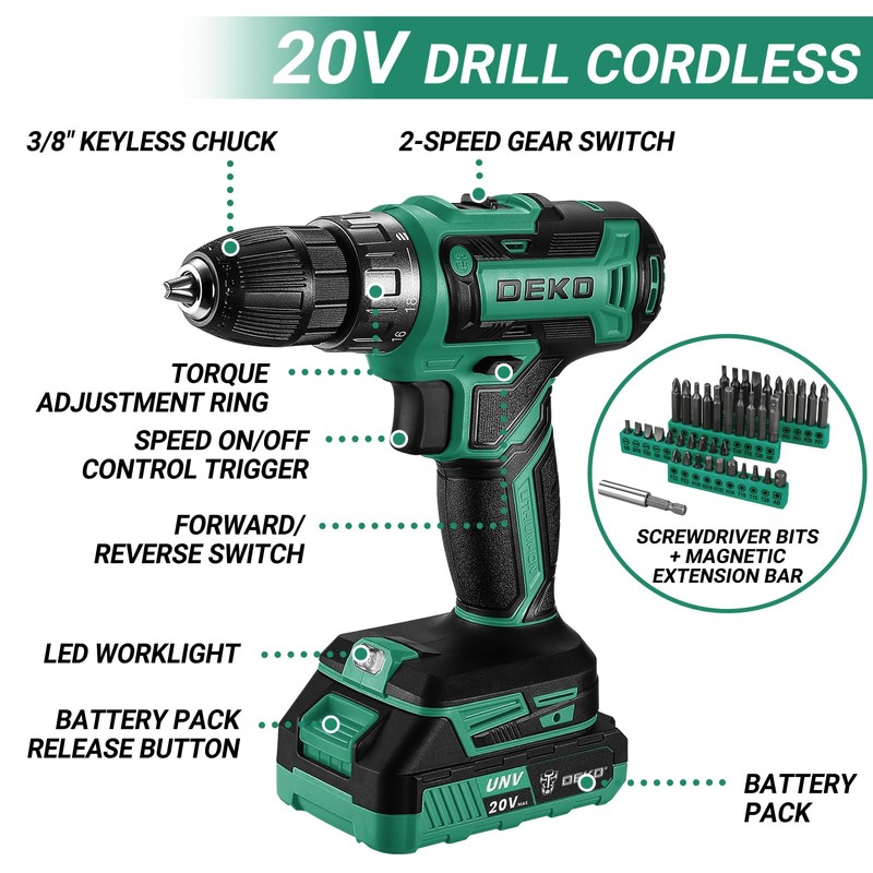 - 【20V POWER DRILL】This 20Volt green power drill has a 1.5Ah rechargeable Lithium-ion battery, quickly fully charged only 1.5 hours and can last for 1-3 hours. It can be last for 5-6 hours for normal household work - DIY or furniture installation etc. The maximum no-load speed of the electric drill is 1350r/min. This green drill tool set has toolbox that includes the type-C charger.