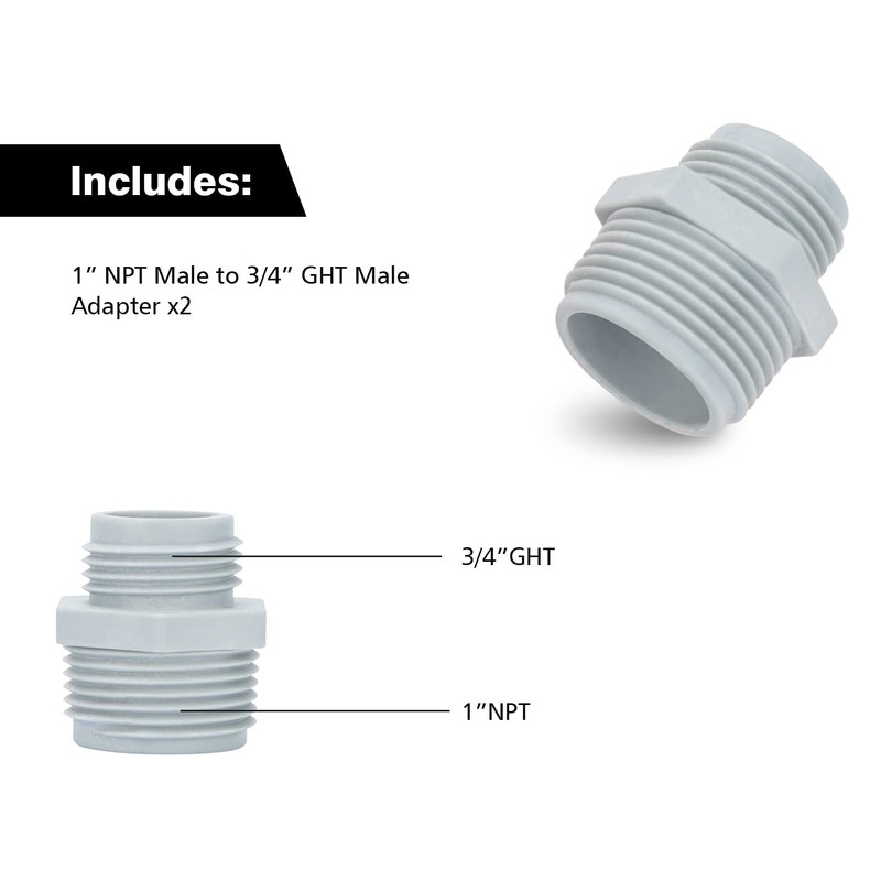 - For connecting threaded outlet of sump pump or pipe to garden hoses.