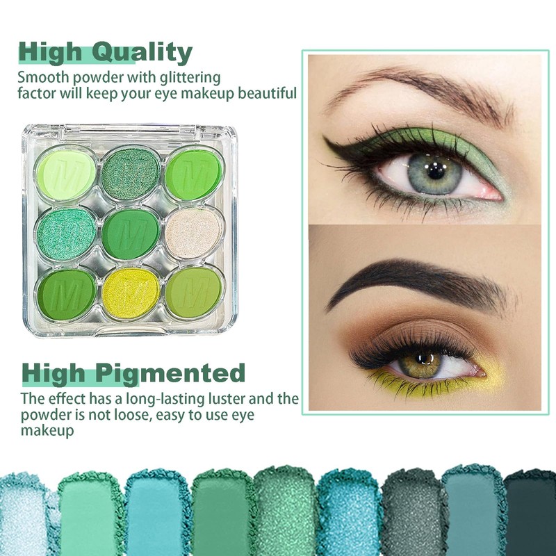 - 【9 Shadow Palette】This eyeshadow palette features green as the main shade, and with the right combination of colours you can create an exaggerated or natural look with these deep, rich and intense eyeshadows.