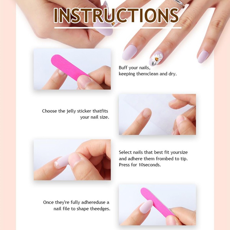 1.Start by gently filing and shaping your natural nails with the included nail file to create a smooth surface to get a better fit.