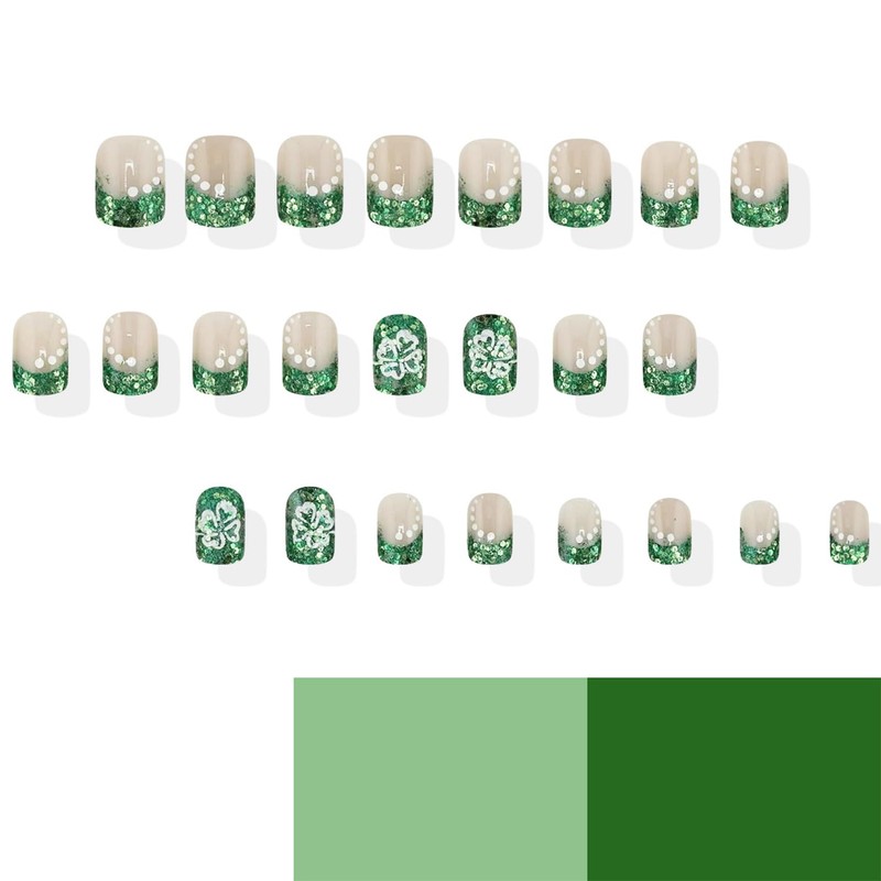 - Package Nails:You'll get 24 St. Patrick's Day false nails in 12 sizes. 1 mini nail file, 1 small wooden stick, 1 piece of adhesive tab glue. You can safely choose a fake nail that fits your finger size and DIY your desired nail shape