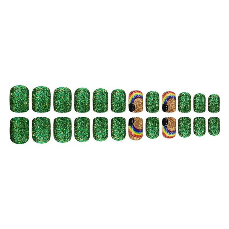 - Package Includes: This St. Patrick's Day nails comes in a beautiful package that includes 24pcs fake nails and 24 pieces of jelly glue, 1mini nail file, 1 wooden stick for removing nails tips