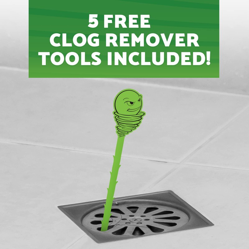 Green Gobbler Drain Clog Dissolver Gobbles the toughest clogs and pipe problems. The thick/high density formula sinks through standing water to reach your problem areas. Our environmentally friendly formula dissolves hair, soap, toilet paper, personal care wipes and other organic materials. Our formula does not contain bleach or sodium hydroxide and is safe for PVC, ABS, copper, and cast-iron household pipes. Our dissolver can be used in the toilet as well and is safe for septic systems. The dual chamber bottle contains 2 applications that are pre-measured, making it easy to use with no measuring required! Our formula is odorless, and fume-free. Green Gobbler stands behind our product and offers a 30-day Money Back Guarantee! If you aren’t completely happy with your results, contact our customer service team for a hassle-free refund. This offer includes 5 hair grabber tools for easy use!!