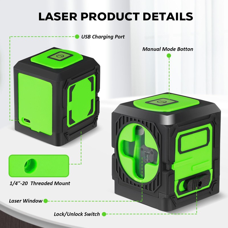 - Good Visibility The green cross line laser has a highly visible green laser beam, which is more clearly visible compared to the red laser.
