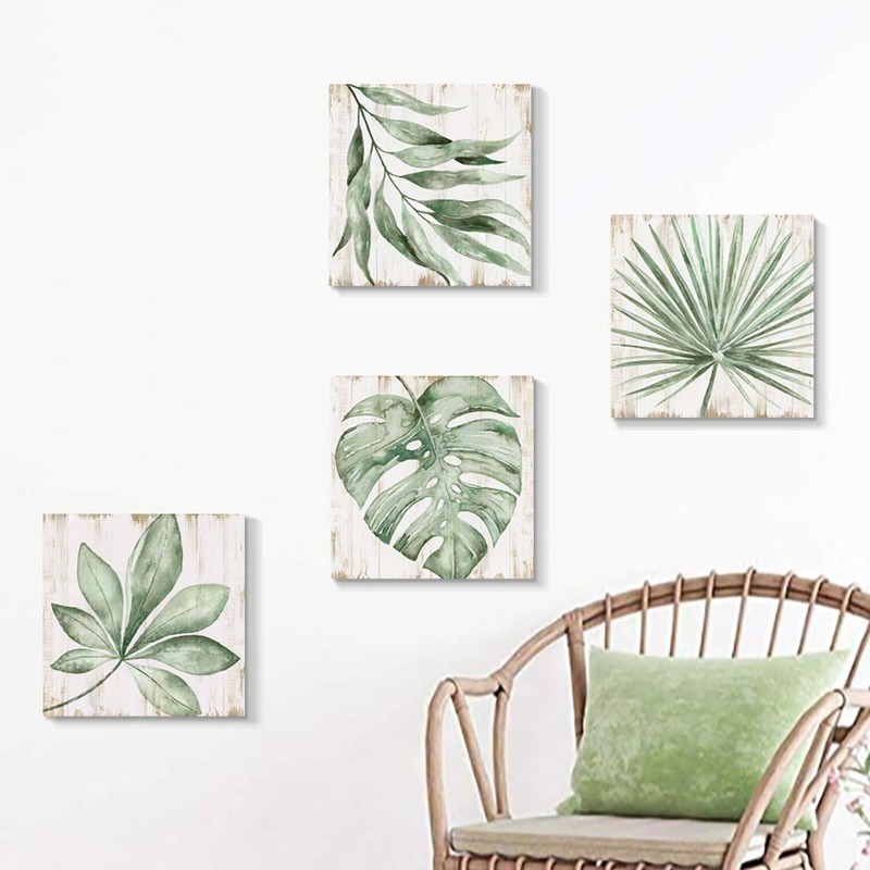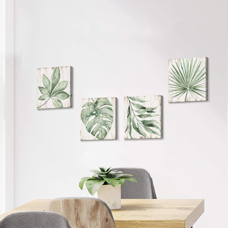 Green Leaves Prints Wall Art: Rustic Wooden Background Palm Tree Leaf Simple Life Painting for Bathroom Wall Decor (12 X 12 X 4)