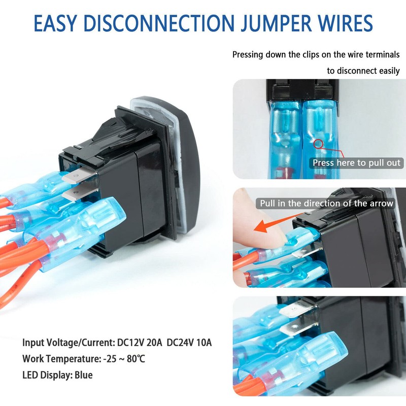 - [Wide Application]: Standard 5 Pin switch, rated at DC 12V/20Amp and DC 24V/10Amp, Fits for most car, SUV, ATV, UTV, 4X4, motorcycle, truck, Jeep, Wrangler, boat, yacht and other off-road vehicles.