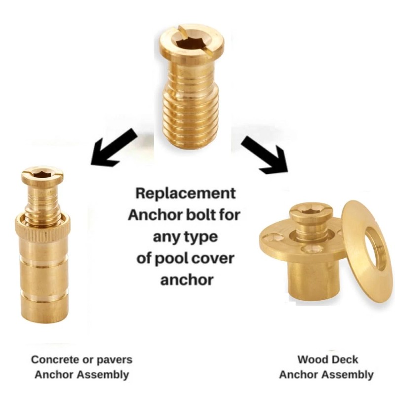 - PACKAGE INCLUDES: The package contains pool cover brass anchor replacement head screw bolts. All the parts are made of premium quality solid brass that will not rust. We offer you better quality and the flexibility of using our brass pool cover anchors on most major brands. Our pool cover installation/removal tool, stainless anchors are perfect for completing outdoor projects.