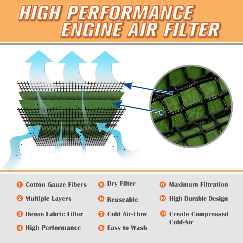 Our reusable Drop in Filter is designed to be the last air filter you buy for the car. It can be cleaned and reused and provides exceptional filtration for your engine. It fits in your OEM air box and replaces the factory filter. Performance is increased as the cotton gauze media filters but does not impede air flow. These filters do not require oil so it does not clog your maf sensor throwing a CEL.