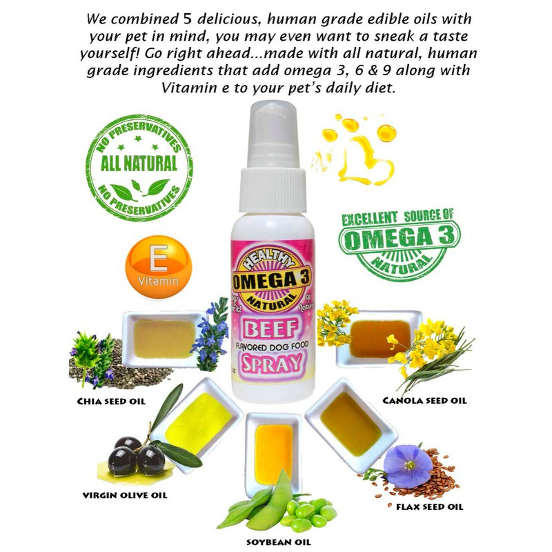 Flavored Omega 3 dog food toppers are delicious and holistic blends ofall natural, human grade, edible oils and natural flavorings that dogs love.Made with human grade edible oils, no artificial ingredients or preservatives.Made in the USA. Flavored sprays can be applied to dry or wet dog food toenhance the aroma and flavor. Flavored sprays add Omega 3 to every meal whichhas been demonstrated to support healthy skin and coat. Great for picky eaters.Will not turn dry dog food mushy or soggy. No refrigeration necessary.Delicious and nutritious, makes every meal a dog treat. Made with Virgin oliveoil, canola seed oil, soybean oil, flax seed oil and chia seed oil along withhuman grade flavorings. Does not contain any protein or salt. One 8 oz bottle willlast 3 months with 2 meals per day and 3-4 sprays per meal.