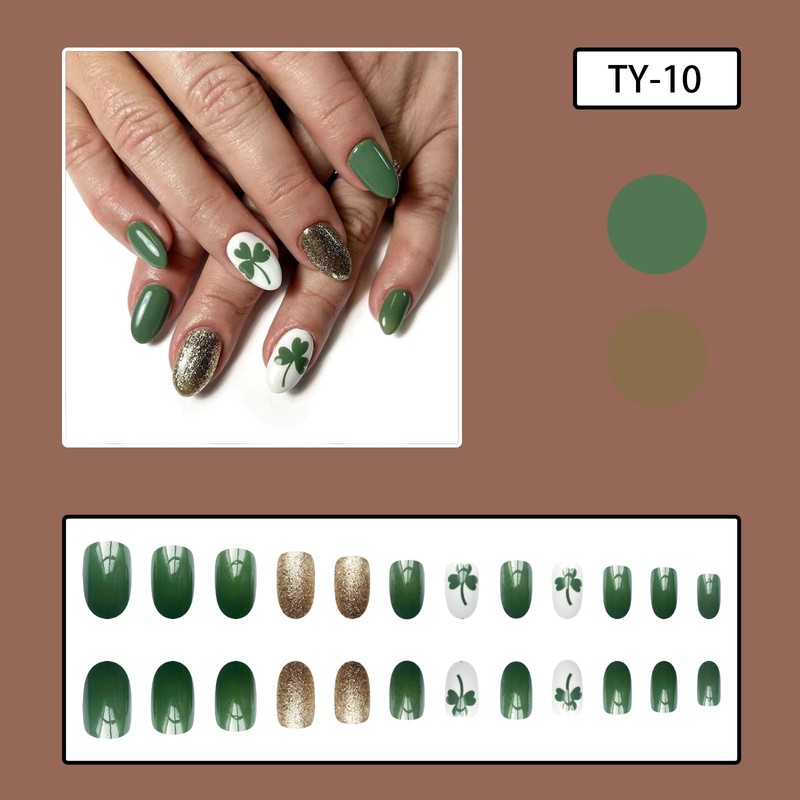 - Package Contents: Package with 24pcs St Patricks Day short almond lucky green shamrock press on nails with clover design,24pcs jelly glue stickers,1pc nail file,1pc wooden stick.Difference sizes artificial nails can repeated use,you can trim it to any length you want,no need to buy other things,you can get acrylic press on nails