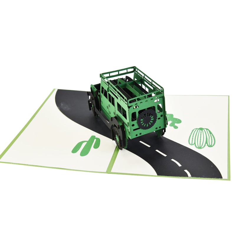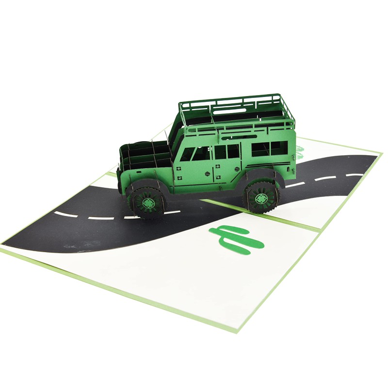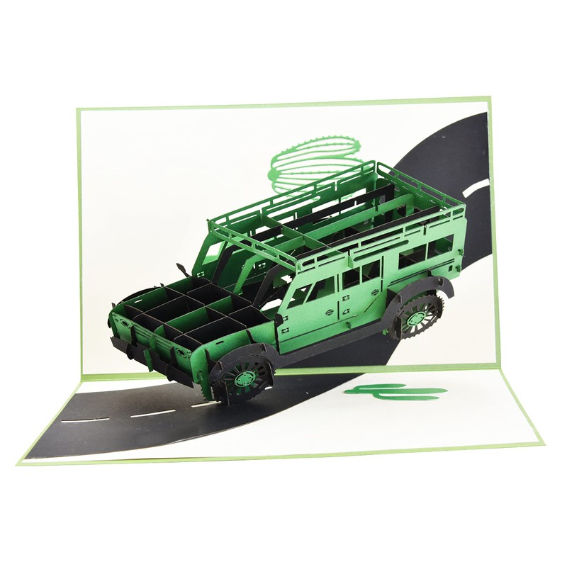 • This beautifully constructed greeting card is ideal for everyone who loves cars. The green cover is made from a high quality, glossy cardstock and features the carved form of an SUV.