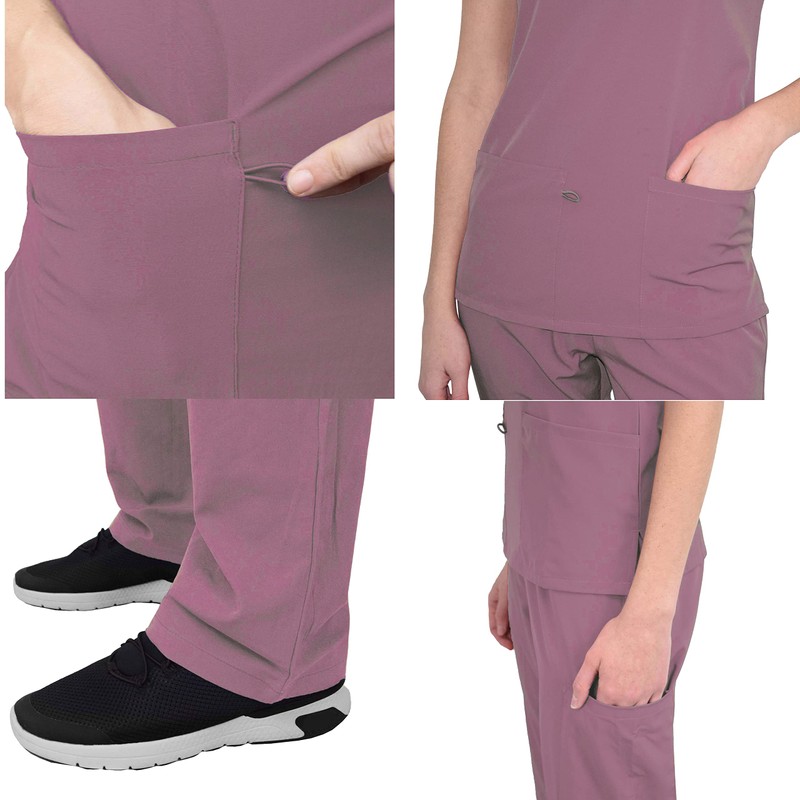 - USEFUL FEATURES: Ideal for the medical field, the V-neck top offers a bungee loop for your ID badge or other accessory and side vents. The straight leg pant features a full elastic and full drawstring closure waistband that stays secure on the waist.