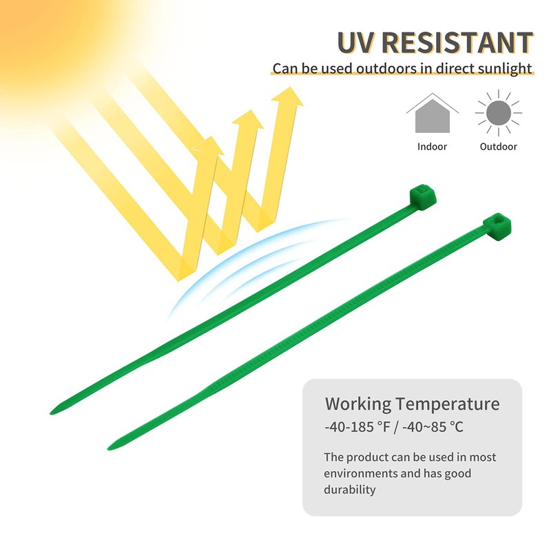 - 【Excellent Quality】The cable ties are made of high quality PA66 nylon with extremely high toughness and tensile strength, heat resistance and UV resistance. Working Temperature: -40~85℃ / -40~185℉; Maximum Tensile Strength 18 lbs
