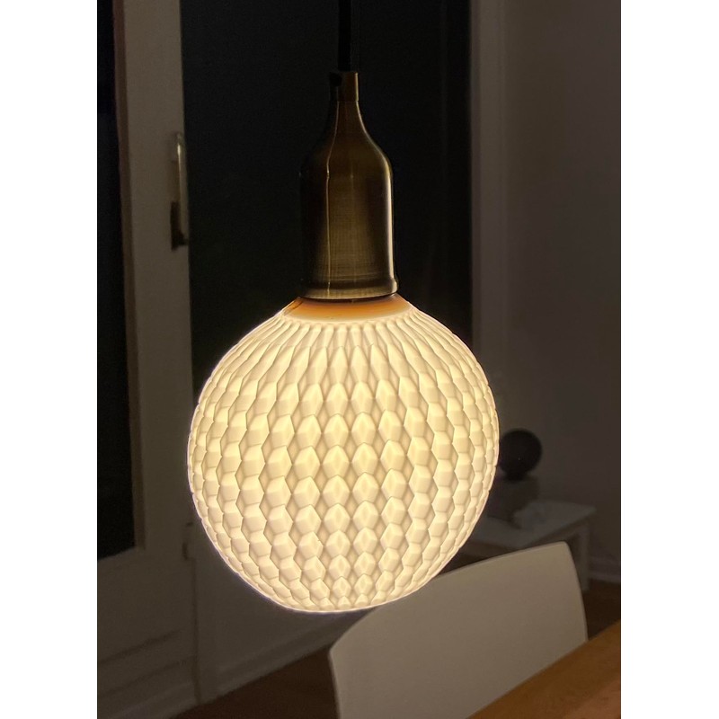 - Sustainability: the lampshade manufactured using 3D printing process is made of PLA, a plastic made from renewable and natural raw materials such as from guaranteed non-genetically modified corn starch. It is also compostable according to DIN 13432 and can be easily separated from the bulb.
