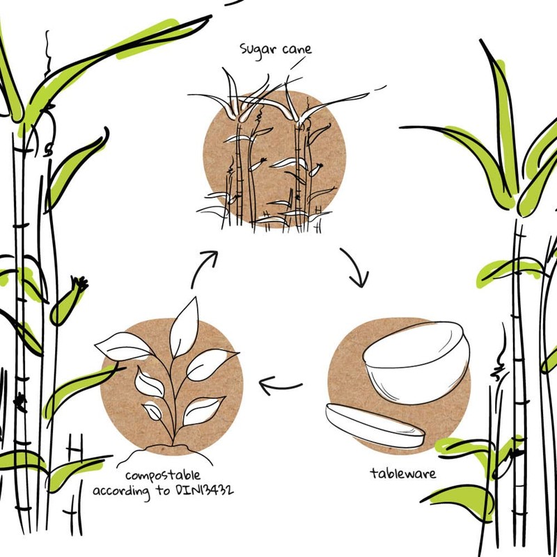 - Sustainable alternative: the bagasse plates are made from the residual fibres of the sugar cane. It is precisely these fibres that a stable disposable product is created