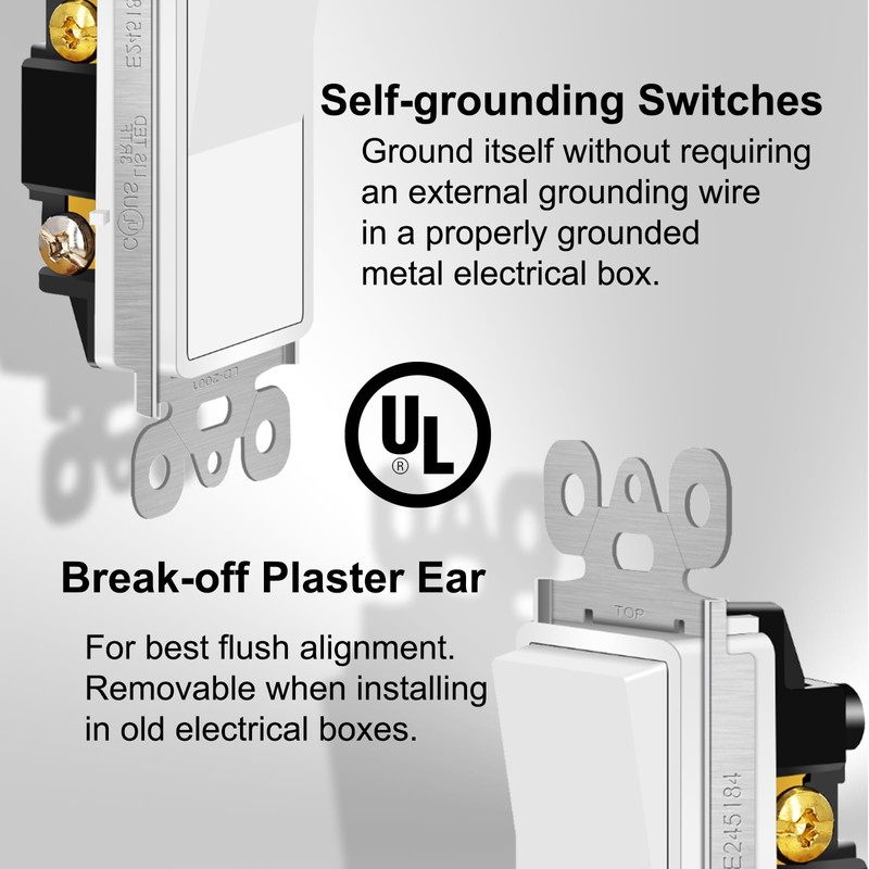 - ✅【Safe and Reliable】Designed with a self-grounding clip for automatic connection in a properly grounded metal wall box, this switch is both safe and reliable. It has undergone rigorous quality testing and is UL listed for added peace of mind.