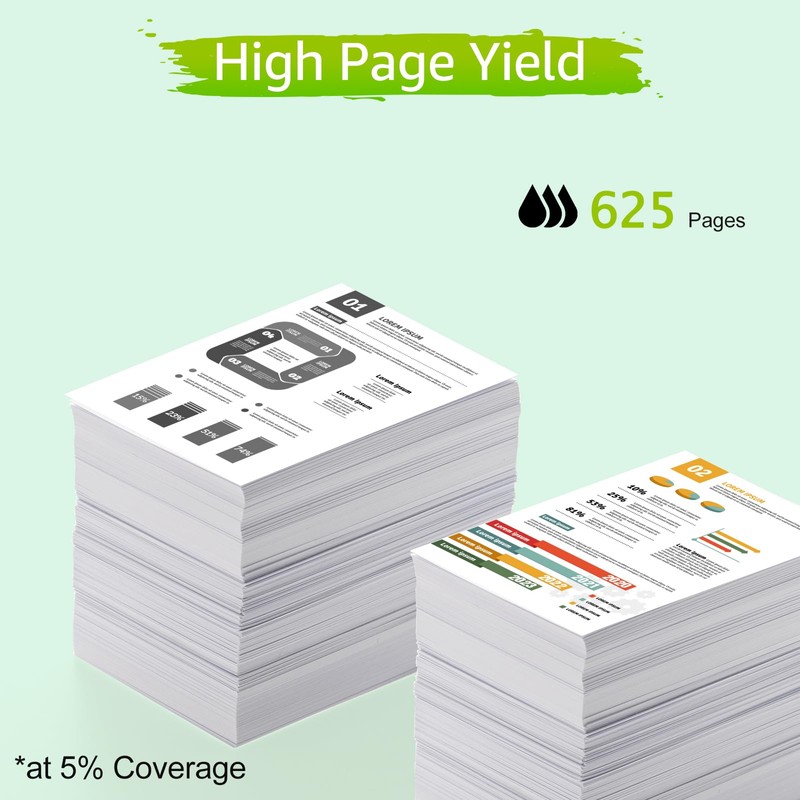 More Printing Pages: High capacity provides more pages to be printed. 625 pages per Black cartridge at 5% coverage.