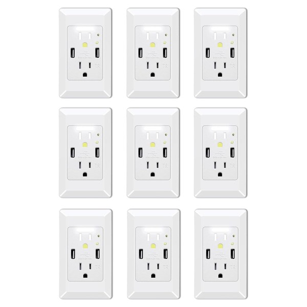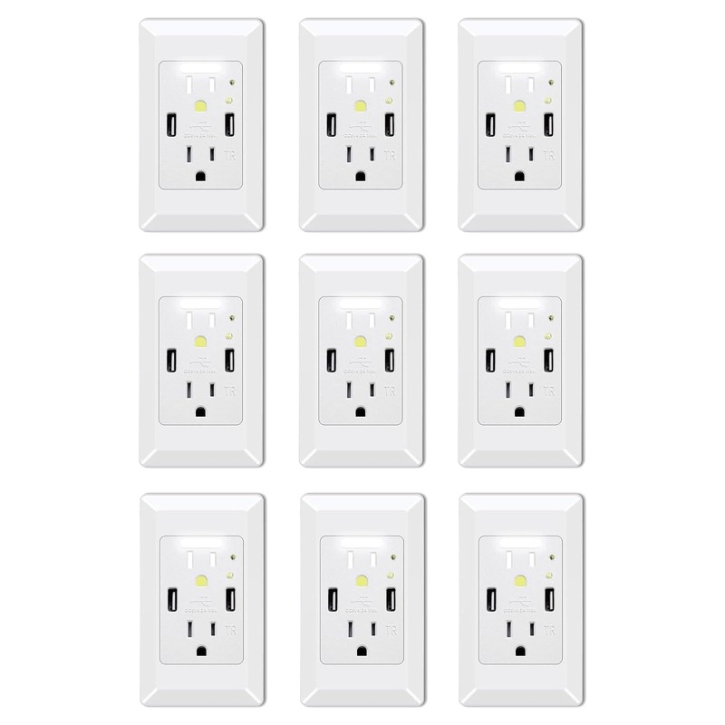GreenCycle USB Outlet with Night Light,Dusk Dawn Sensor,4.2A High Speed Duplex Receptacle Electrical AC Wall Outlets,with Wall Plates,White,9 Pack