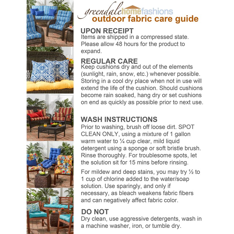 Enhance the look and feel of your patio furniture with this Greendale Home Fashions Deep Seat Cushion Set covered with high-performance Sunbrella fabric. The poly-wrapped foam seat cushion retains its firm shape, and comes with a zipper closure. The plush back pillow is overstuffed with a soft polyfiber fill made from 100% recycled, post-consumer plastic bottles, and features a sewn closure. Cushions are covered with a UV resistant, 100% acrylic outdoor fabric that resists fading, stains, water and mildew. Both cushions feature a decorative trim cording. This set is the perfect replacement for many wrought iron and rattan original chair sets. A variety of colors are available to enhance your outdoor decor. **Please Note:** Cushion dimensions are +/- 2 inches. Product will arrive in a slightly compressed state; please allow a few days for product to expand to final size listed in description.