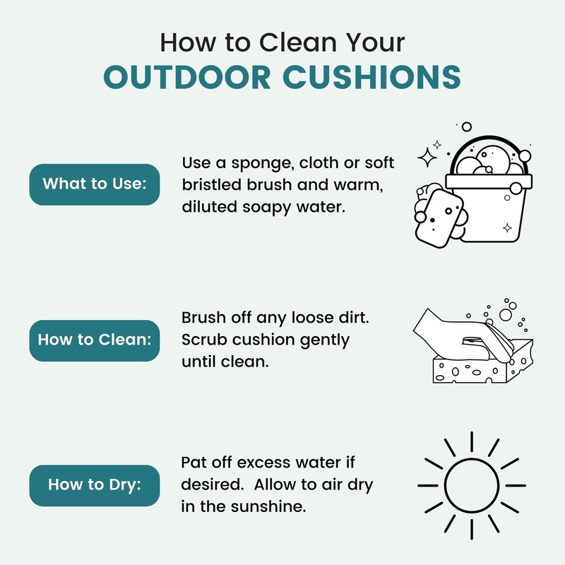 • LOW-MAINTENANCE CARE: Keep your cushions looking like new by storing them covered when not in use, and spot cleaning as needed with a soft sponge or cloth, and warm, diluted soapy water. Allow to air dry in the sun.
