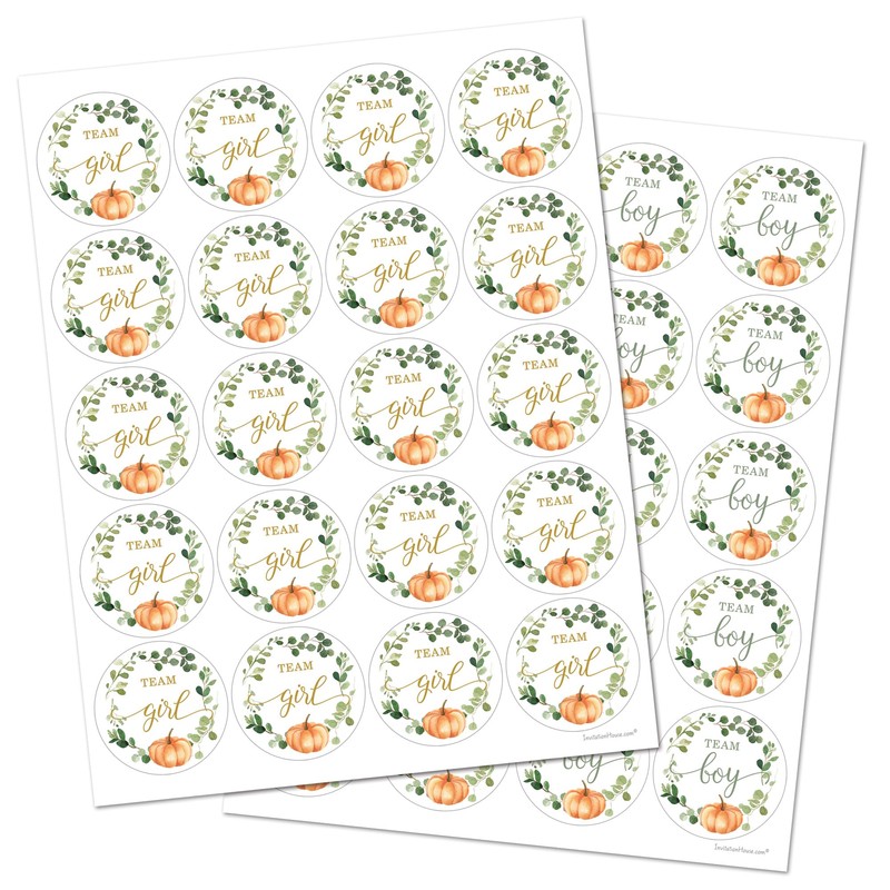 These greenery pumpkin stickers are perfect for your gender reveal party.