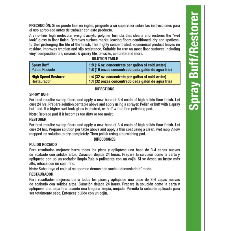 Its excellent polishing and restoring ability removes surface marks, leaving floors conditioned, dry and spotless further prolonging the life of the finish. This highly concentrated, economical product can be diluted for application as both a spray buff and high speed restorer.