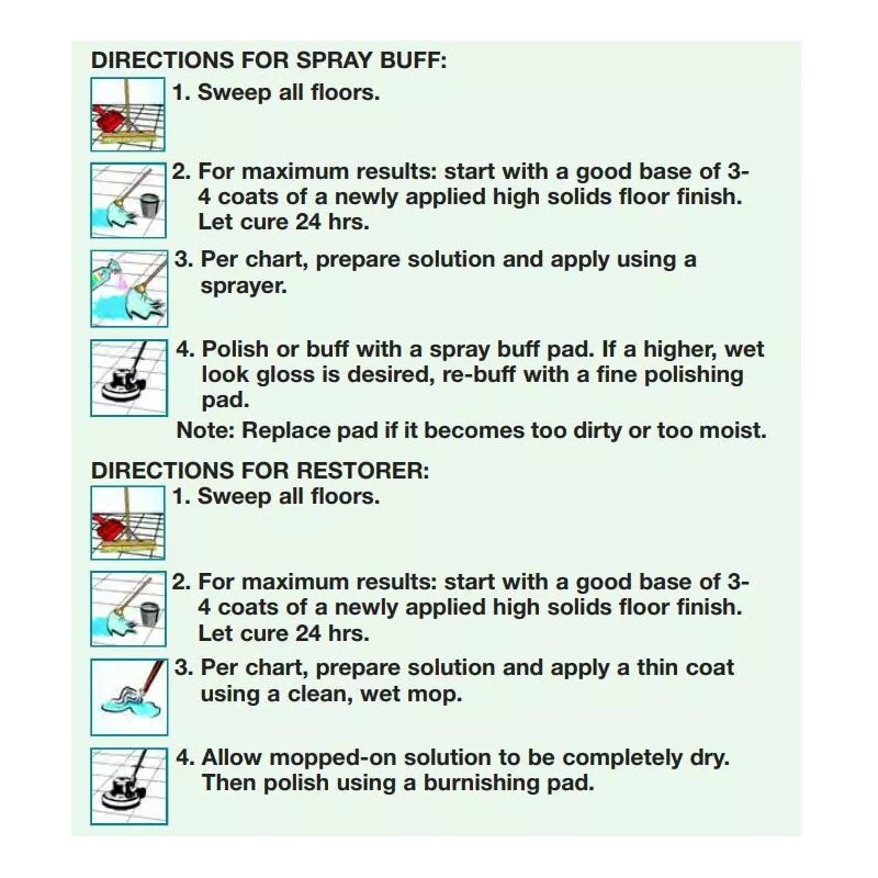 Its excellent polishing and restoring ability removes surface marks, leaving floors conditioned, dry and spotless further prolonging the life of the finish. This highly concentrated, economical product can be diluted for application as both a spray buff and high speed restorer.