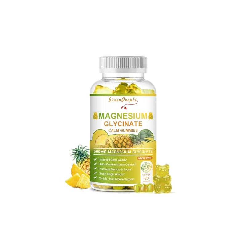 GREENPEOPLE Magnesium Glycinate Gummies with Citrate 1000mg, Taurate & Matale - Sugar Free - Magnesium Potassium Supplement with Vitamin D, K2 for Calm Mood & Zzz Support - 60 Pineapple Gummies-2 Pack