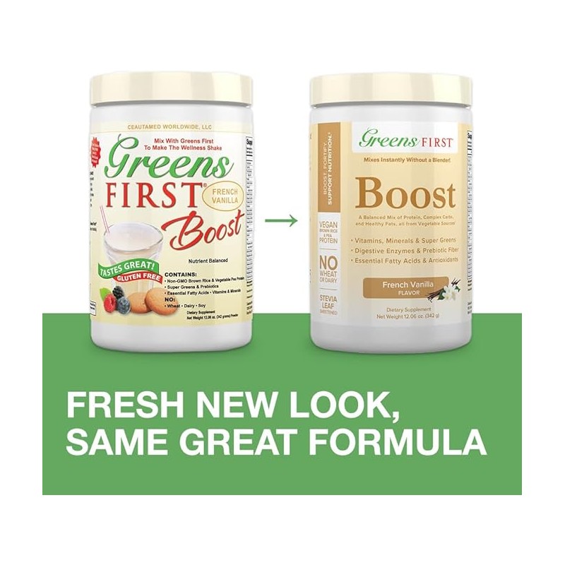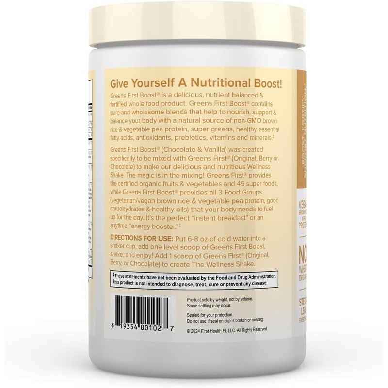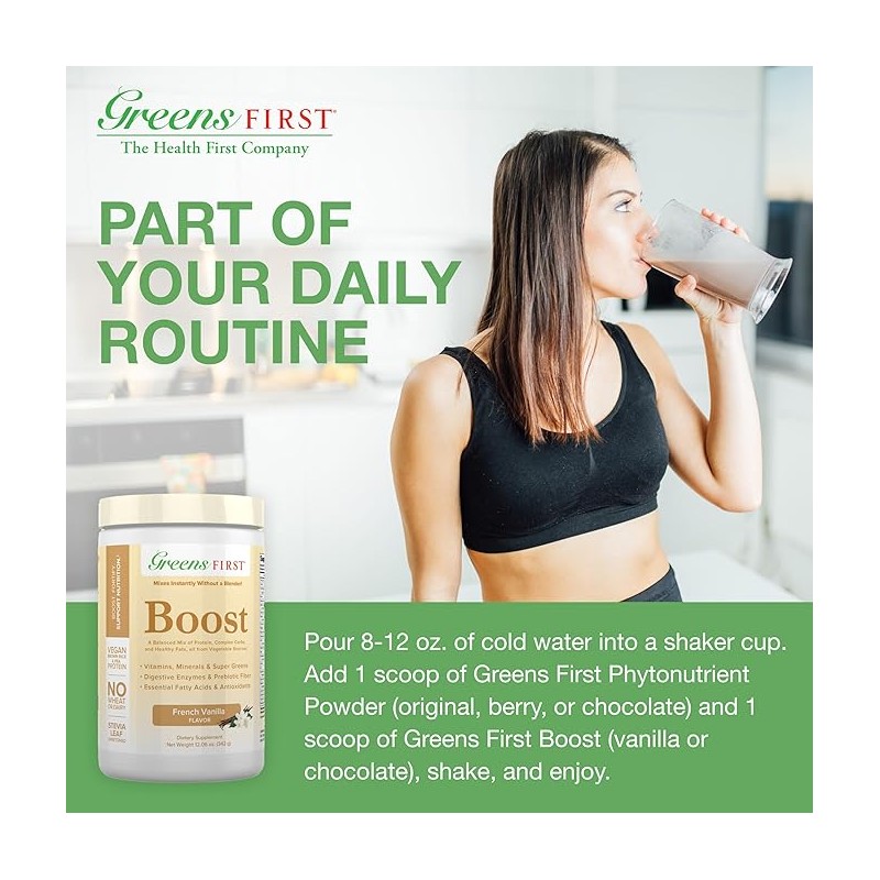 Greens First Boost - Plant-Based Protein & Balanced Nutrition - Superfood Shake Mix - No Wheat or Soy - Dairy-Free - Vegan - French Vanilla, 12.06 oz.