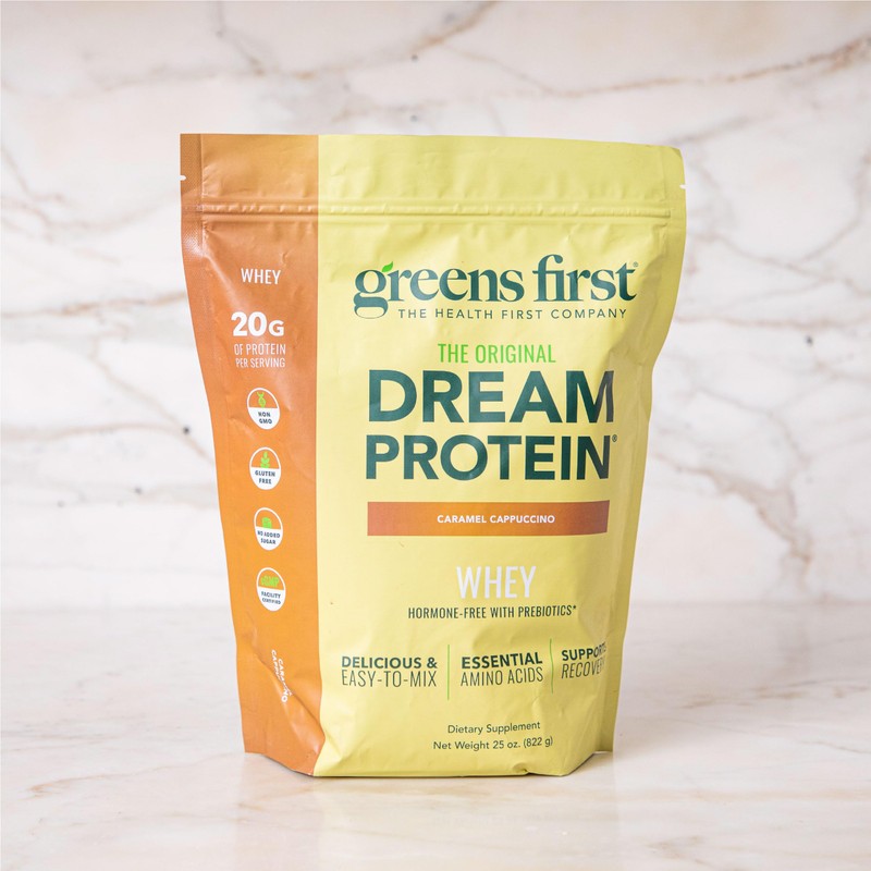 - A Protein You Can Trust for Long-Term Wellness. At Greens First, we’ve been helping families live their healthiest lives for over 25 years, and Dream Protein Whey Caramel Cappuccino is the latest addition to our legacy of trusted products. Made with hormone-free, ultra-low-temp whey protein isolate and concentrate, this protein powder delivers 20g of protein per scoop without any artificial sweeteners. We’re proud to offer a protein you can feel good about - one that’s simple, clean, and crafted