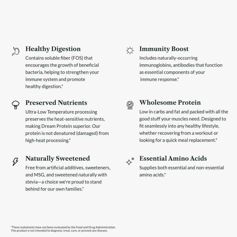 - Protein Your Body Craves, Without the Fillers. Dream Protein Whey is low in carbs and fat and packed with all the good stuff your muscles need. With just 90 calories per scoop, this protein powder is designed to fit seamlessly into any healthy lifestyle, whether recovering from a workout or looking for a quick meal replacement. It’s free from artificial additives, sweeteners, and MSG, and sweetened naturally with stevia - a choice we’re proud to stand behind for our own families.