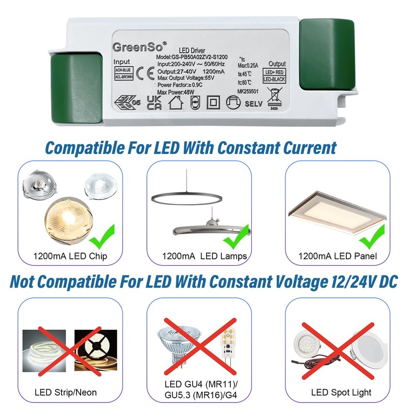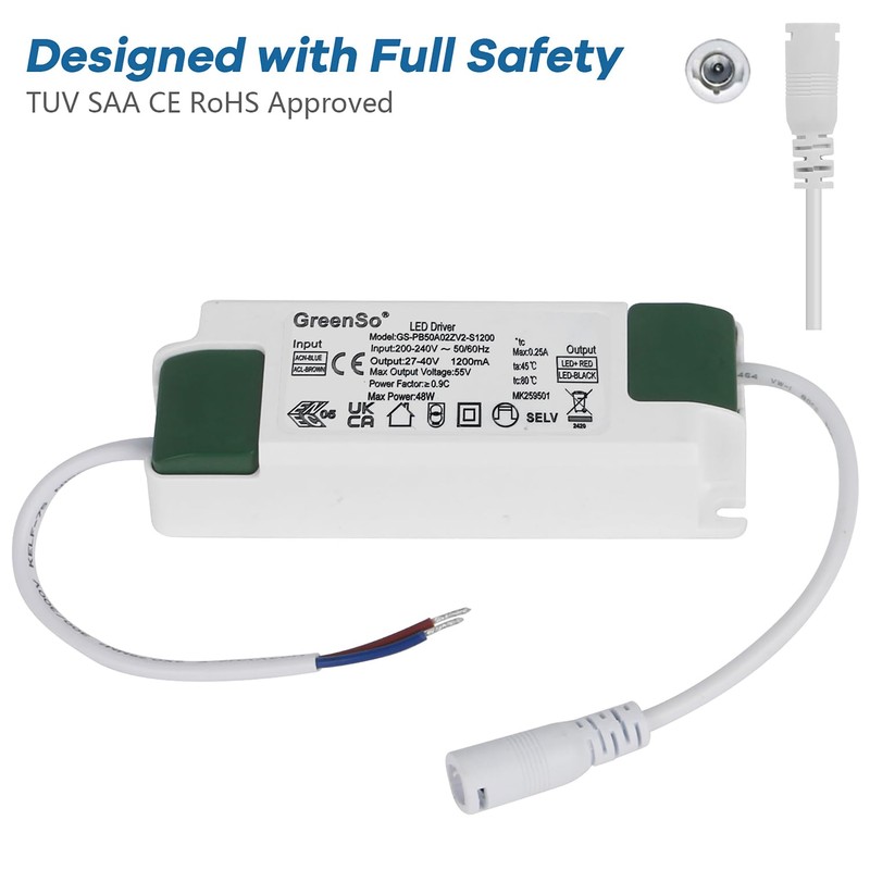 GreenSo 50W Transformator, LED Treiber, Netzteil AC200-240V und DC27-40V, 1200mA Konstantstrom Trafo für 60x60cm 62x62cm 120x30cm LED-Panel-Licht GS-PA50A02-1200 TÜV CE SAA RoHS Zertifikate (1 Stück)