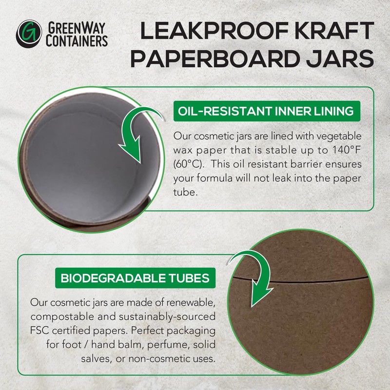 - PLANT-BASED WAX LINING – 100% recycled kraft paper on the outside and white on the inside, our empty jars feature a plant-based wax paper lining. This oil-resistant inner lining is fully biodegradable and creates an oil-proof shield from the outer paper. However, it is not suitable for water-based formulations.